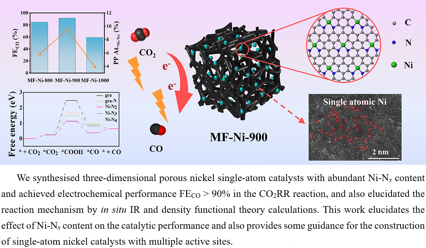 Melamine foam (MF) is a highly cross-linked thermosetting organic porous plastic with high mass transfer rates and nitrogen content. The pristine framework of this material possesses a high specific surface area and through pores, which facilitate the diffusion of reactants (carbon dioxide) and desorption of products. Furthermore, the pyrolysis of MF results in the formation of N-doped carbon in the form of graphene-like structures. This process enhances the electrical conductivity of the material and prevents agglomeration into particles by anchoring the nickel single-atom with nitrogen atoms. Herein, in this paper we synthesized Ni SACs by MF pyrolysis. The goal was to form Ni-Nx structures with highly active sites to improve CO2RR selectivity. The X-ray photoelectron spectroscopy (XPS) test results showed a peak content of Ni-Nx sites in the material (9.47 at.%) at a calcination temperature of 900 °C, a value significantly higher than other calcination temperatures. The Faradaic efficiency of CO (FECO) at -0.66 V vs. reversible hydrogen electrode (RHE) could reach 91% and maintain the basic performance (FE > 80%) after 35 h of testing. This finding indicated that Ni-Nx was the primary active site of CO2RR and its content exhibited a direct correlation with catalytic activity. In situ infrared spectroscopy (IR) and the density functional theory (DFT) calculations indicated that high-temperature calcination might promote the stable coordination of Ni with N, modulate the electronic state of Ni, and enhance the adsorption of the reaction intermediate *CO. The results of this experiment demonstrate the potential of a novel approach to the construction of porous catalysts with a binding effect.