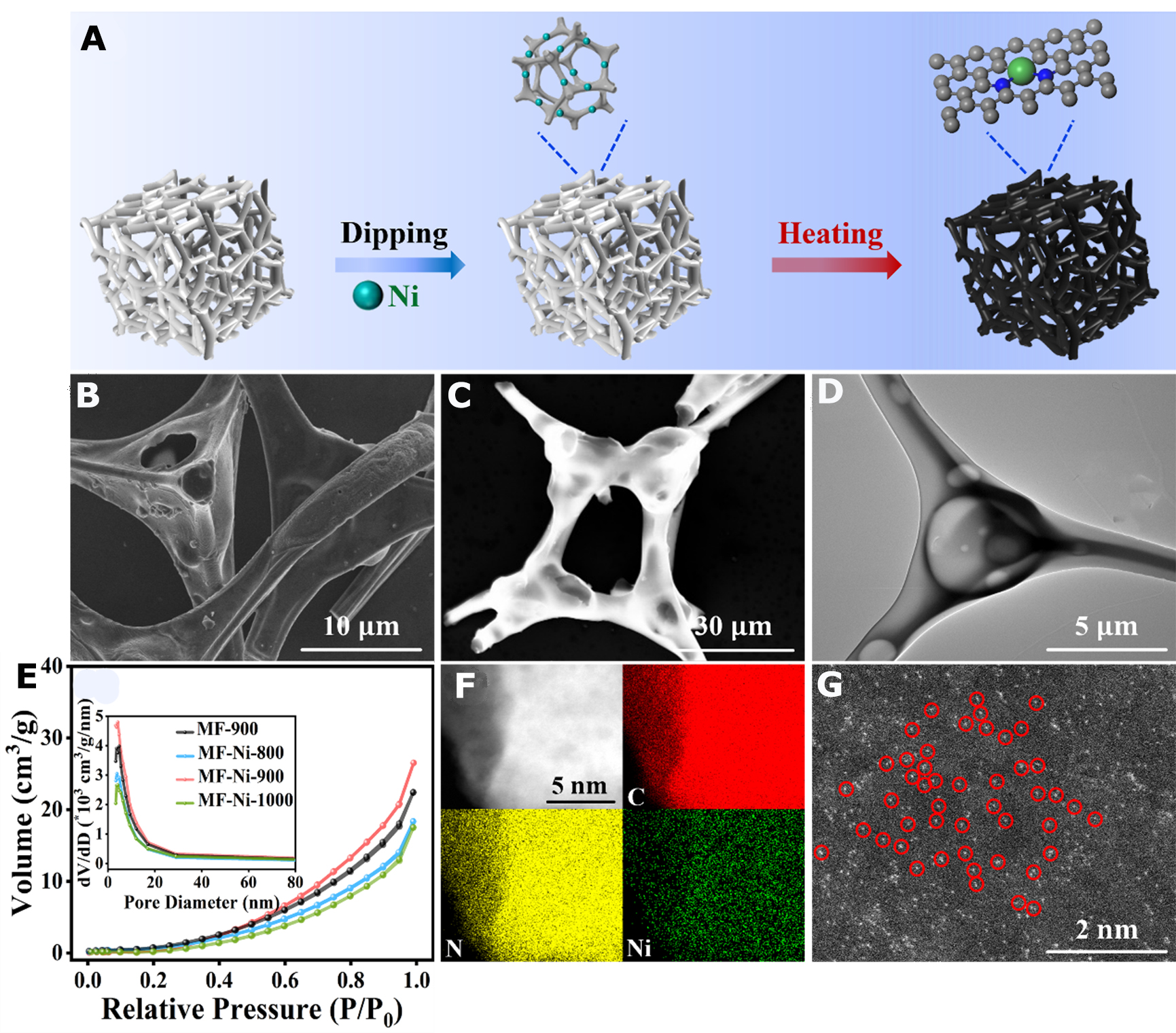Figure 1. (A) Schematic diagram of catalyst synthesis; (B-D) SEM images (B-C), HR-TEM image (D) of MF-Ni-900; (E) N2 adsorption and desorption curves and pore size distributions; (F) EDS images of MF-Ni-900; (G) AC-TEM image of MF-Ni-900. SEM: Scanning electron microscope; HR-TEM: high-resolution transmission electron microscope; MF: melamine foam; EDS: energy dispersive spectroscopy; AC-TEM: spherical aberration corrected transmission electron microscope.