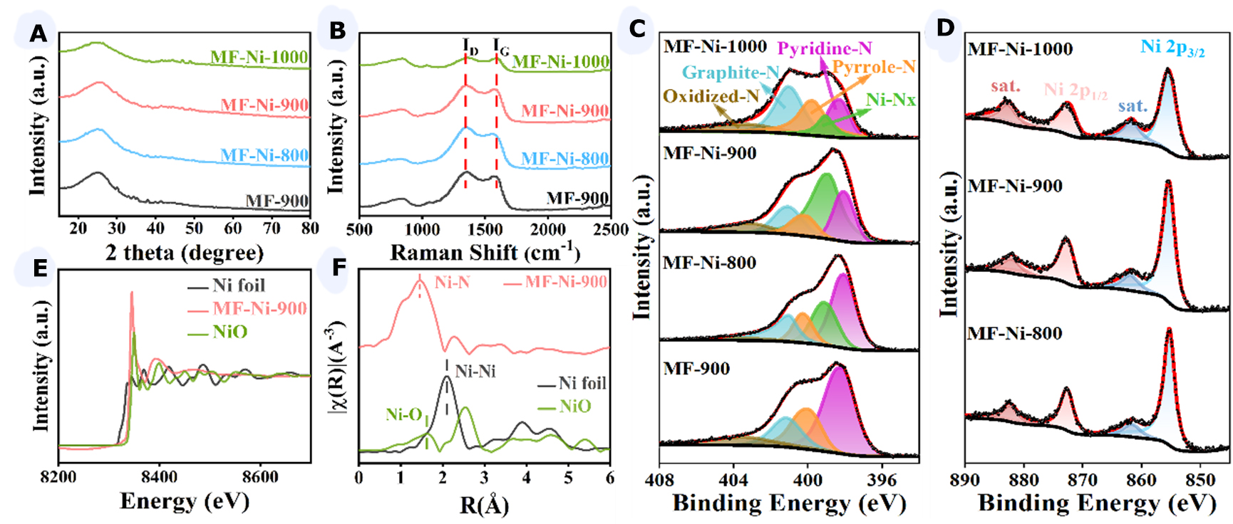 Figure 2. (A-C) XRD image (A), Raman image (B), N 1s spectrum of XPS image (C) of MF-900, MF-Ni-800, MF-Ni-900, and MF-Ni-1000; (D) Ni 2p spectrum of XPS image of MF-Ni-800, MF-Ni-900, and MF-Ni-1000; (E) Ni K-edge XANES spectra; (F) Fourier transform EXAFS spectra for MF-Ni-900, Ni foil, and NiO. XRD: X-ray diffraction; XPS: X-ray photoelectron spectroscopy; MF: melamine foam; XANES: X-ray absorption near edge structure; EXAFS: extended X-ray absorption fine structure.