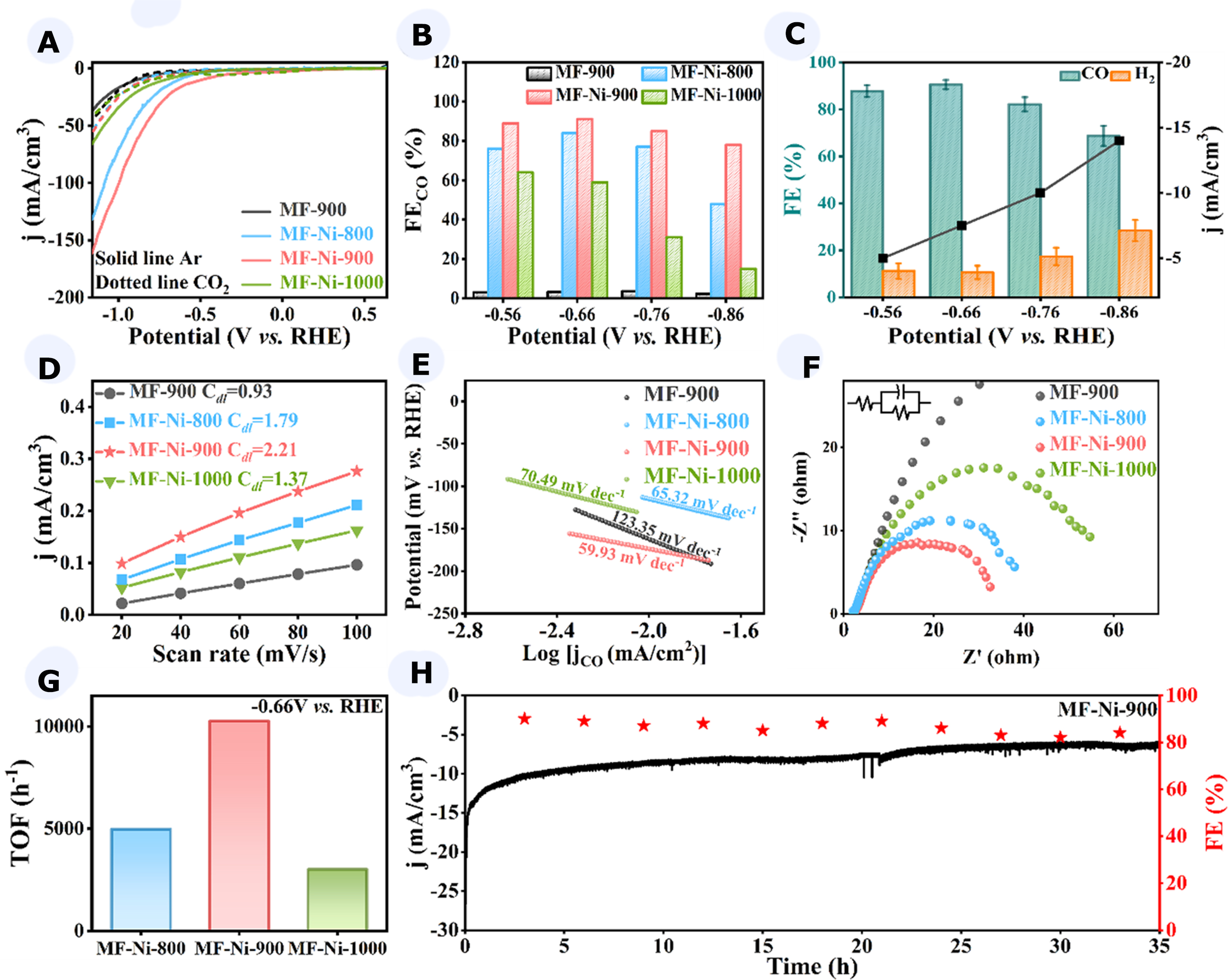 Figure 3. (A) Linear sweep voltammetry (LSV) image of catalysts in Ar-saturated or CO2-saturated 0.5 M KHCO3 electrolytes; (B) FECO image of catalysts at -0.56 to -0.86 V vs. RHE potentials; (C) CO Faradaic efficiency error bars and current density image of MF-Ni-900; (D-G) ECSA linear image (D), Tafel image (E), EIS image (F), TOF image (G) of MF-900, MF-Ni-800, MF-Ni-900, and MF-Ni-1000; (H) 35 h long-term stability of MF-Ni-900. FECO: Faradaic efficiency of CO; RHE: reversible hydrogen electrode; MF: melamine foam; ECSA: electrochemically active surface area; EIS: electrochemical impedance spectroscopy; TOF: transition frequency.