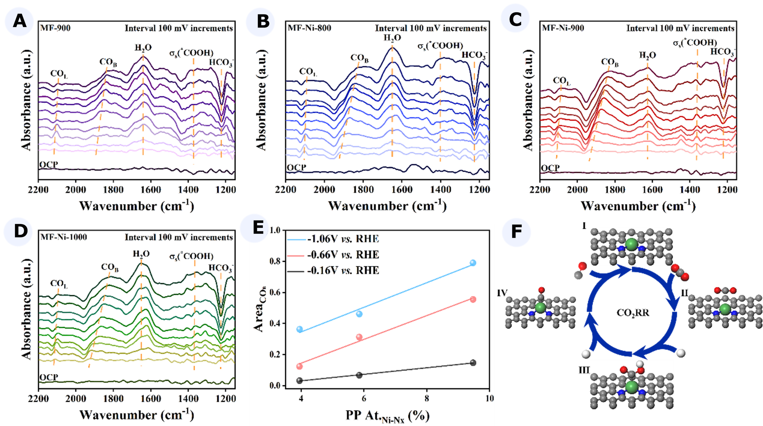 Figure 4. (A-D) At -0.16 to -1.06 V vs. RHE potentials, in situ IR images of MF-900 (A), MF-Ni-800 (B), MF-Ni-900 (C), and MF-Ni-1000 (D); (E) Linear relationship between COB peak area and Ni-Nx content; (F) Mechanism diagram of CO2 to CO. RHE: Reversible hydrogen electrode; IR: infrared spectroscopy; MF: melamine foam; COB: CO adsorption.