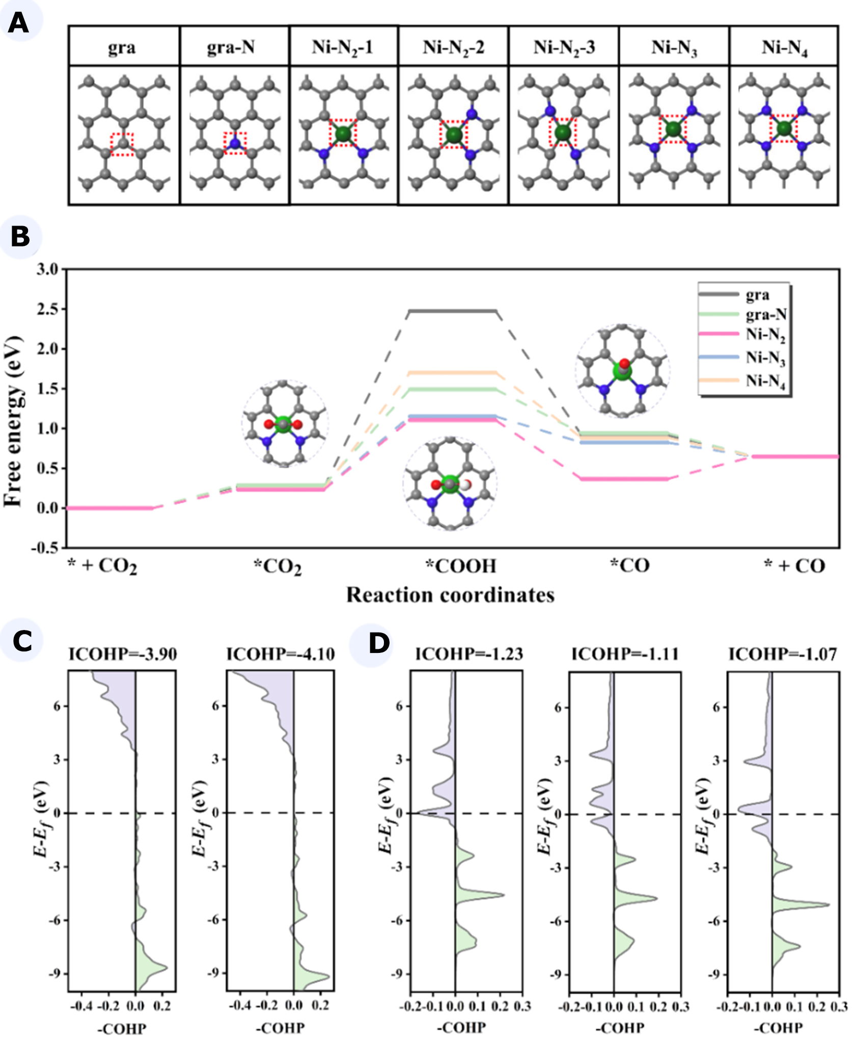 Figure 5. (A) The optimized structures of different active sites on the Ni-Nx surface; (B) The Gibbs free energy profile of CO2RR to CO on gra, gra-N, Ni-N2, Ni-N3, and Ni-N4. The COHP for COOH adsorbed on active site of (C) gra and gra-N, (D) Ni-N2, Ni-N3, and Ni-N4. CO2RR: Carbon dioxide reduction reaction; COHP: crystal orbital Hamilton populations.