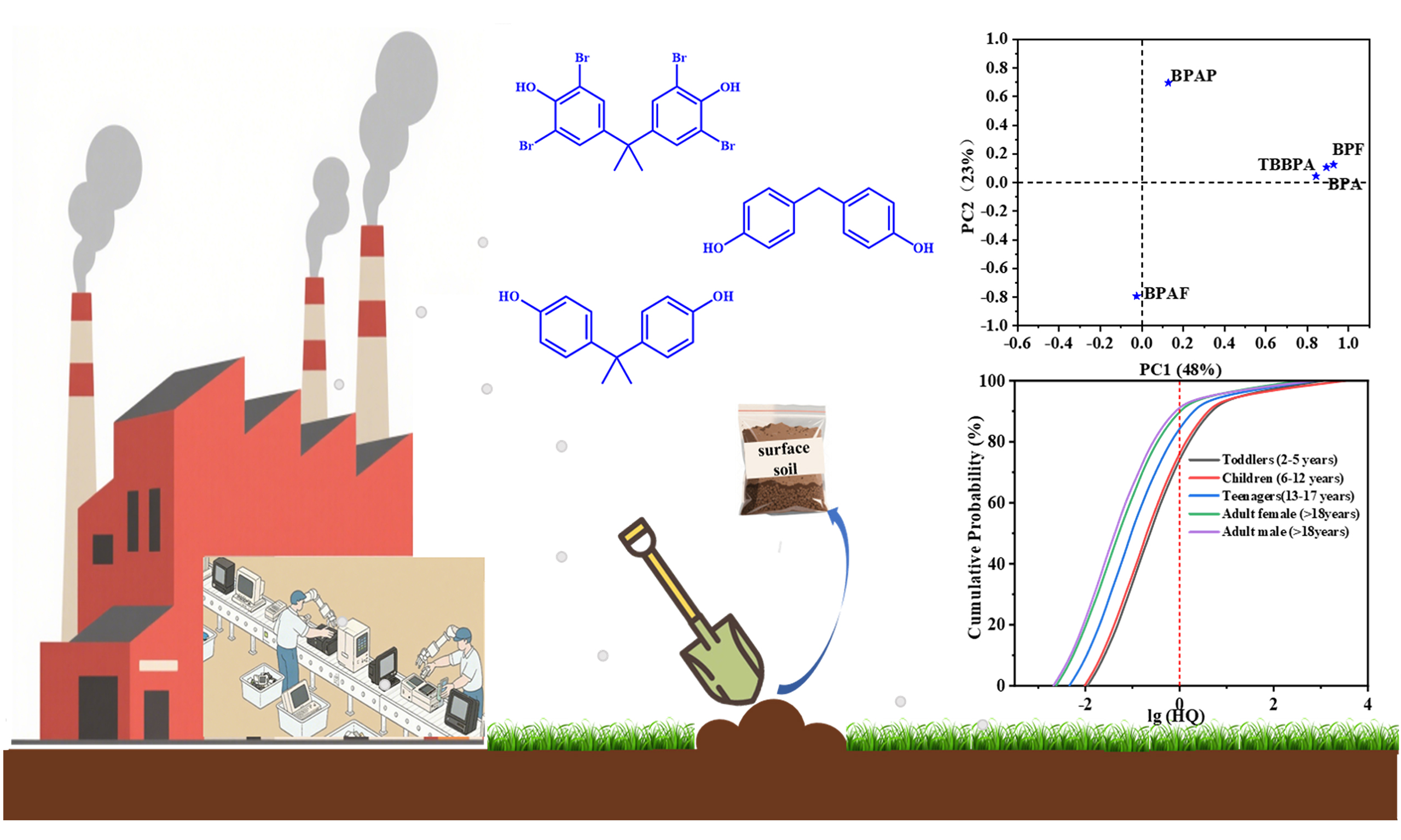 Traditional electronic waste (E-waste) dismantling activities release substantial bisphenol analogues (BPs). In recent years, China has promoted the transformation of traditional E-waste dismantling parks into circular economy parks, yet the contamination characteristics of BPs under this new model remain poorly understood. In the present study, we systematically analyzed the pollution characteristics and health risks of 10 BPs in soils surrounding four circular economy E-waste parks [Ziya (ZY) in Tianjin, Fengjiang (FJ) and Binhai (BH) in Zhejiang, and Qingyuan (QY) in Guangdong]. The results showed that BPs were widely detected in soils surrounding the parks, with bisphenol A (BPA) accounting for 55%-77% of total concentrations, followed by tetrabromobisphenol A (TBBPA) (6%-33%) and bisphenol F (BPF) (5%-14%). Significant inter-park heterogeneity was observed: FJ exhibited higher median BPA, BPF, and TBBPA than ZY (P < 0.05), while its BPF concentrations surpassed those in BH and QY (P < 0.05). Further correlation and principal component analyses revealed strong positive associations among BPA, BPF, and TBBPA (r = 0.638-0.873), which collectively loaded highly on PC1 (33%-52%), and their co-release mechanisms were closely related to the E-waste dismantling and incineration process. In addition, the spatial distribution of BPs showed a radial decline with each park as the core, suggesting potential health risks to surrounding populations. Risk assessment using estimated daily intake showed that BPA exposures exceeded the European Food Safety Authority’s updated tolerable daily intake. Monte Carlo simulation indicated that 97%, 60%, 80%, 25%, and 15% of the population were at risk of non-carcinogenic effects from BPA, BPF, bisphenol AF, bisphenol S, and bisphenol AP, respectively.