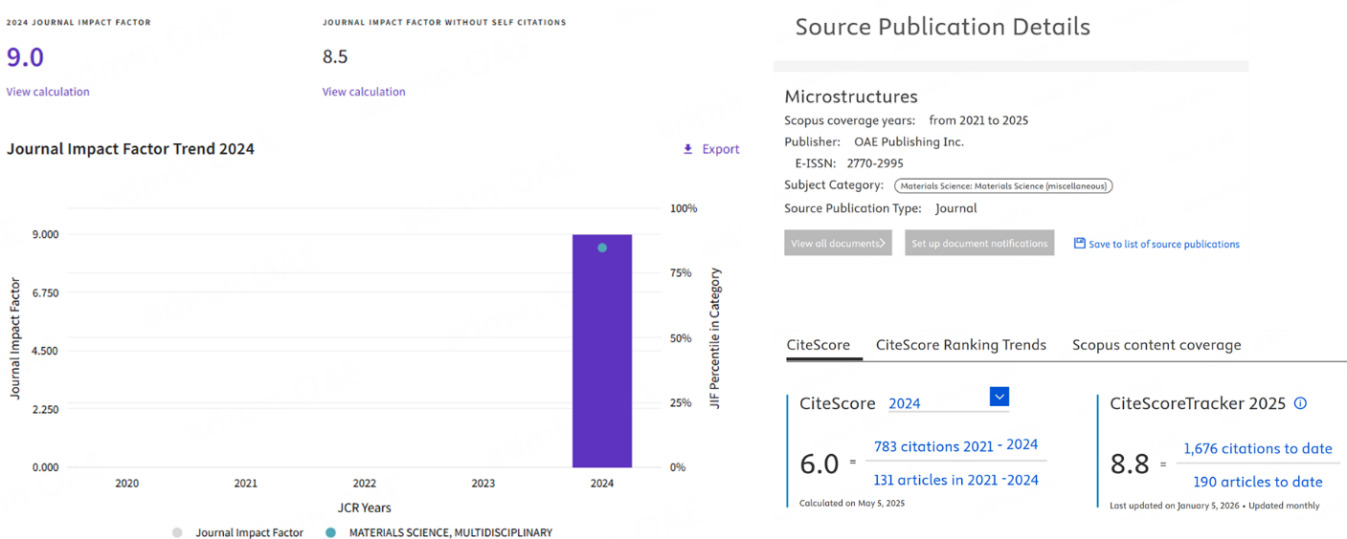 In June 2025, Clarivate Analytics released the 2024 edition of the Journal Citation Reports (JCR). Microstructures received its first Impact Factor (IF) of 9.0, four years after its launch in 2021. The journal ranked 70th out of 460 journals in the category Materials Science, Multidisciplinary, placing it in Q1 (top 16%). During the same period, Scopus released updated CiteScore metrics. Microstructures achieved a 2024 CiteScore of 6.0, rising from 3.1 the previous year. The 2025 CiteScoreTracker reached 8.8 by the end of the year. These metrics indicate a steady increase in the journal's academic visibility and citation performance.