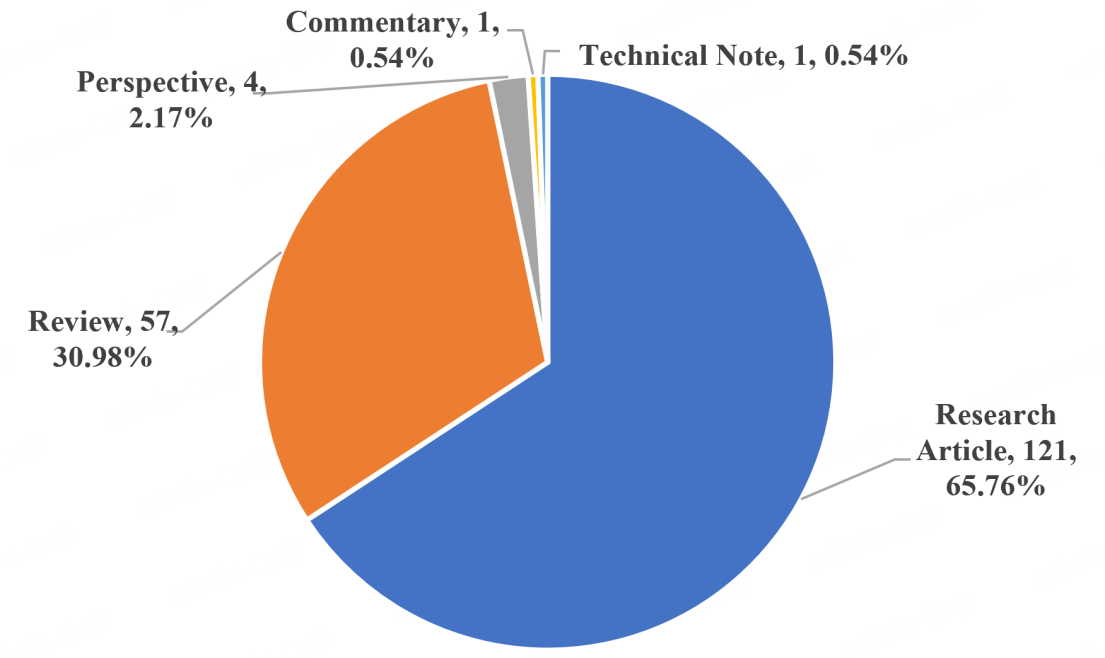 In 2025, Microstructures received a total of 184 submissions. Among these manuscripts, Research Articles accounted for 65.76%, followed by Reviews (30.98%), Perspectives (2.18%), Commentaries (0.54%), and Technical Notes (0.54%). This distribution reflects a primary emphasis on original research, supported by high-quality review articles.