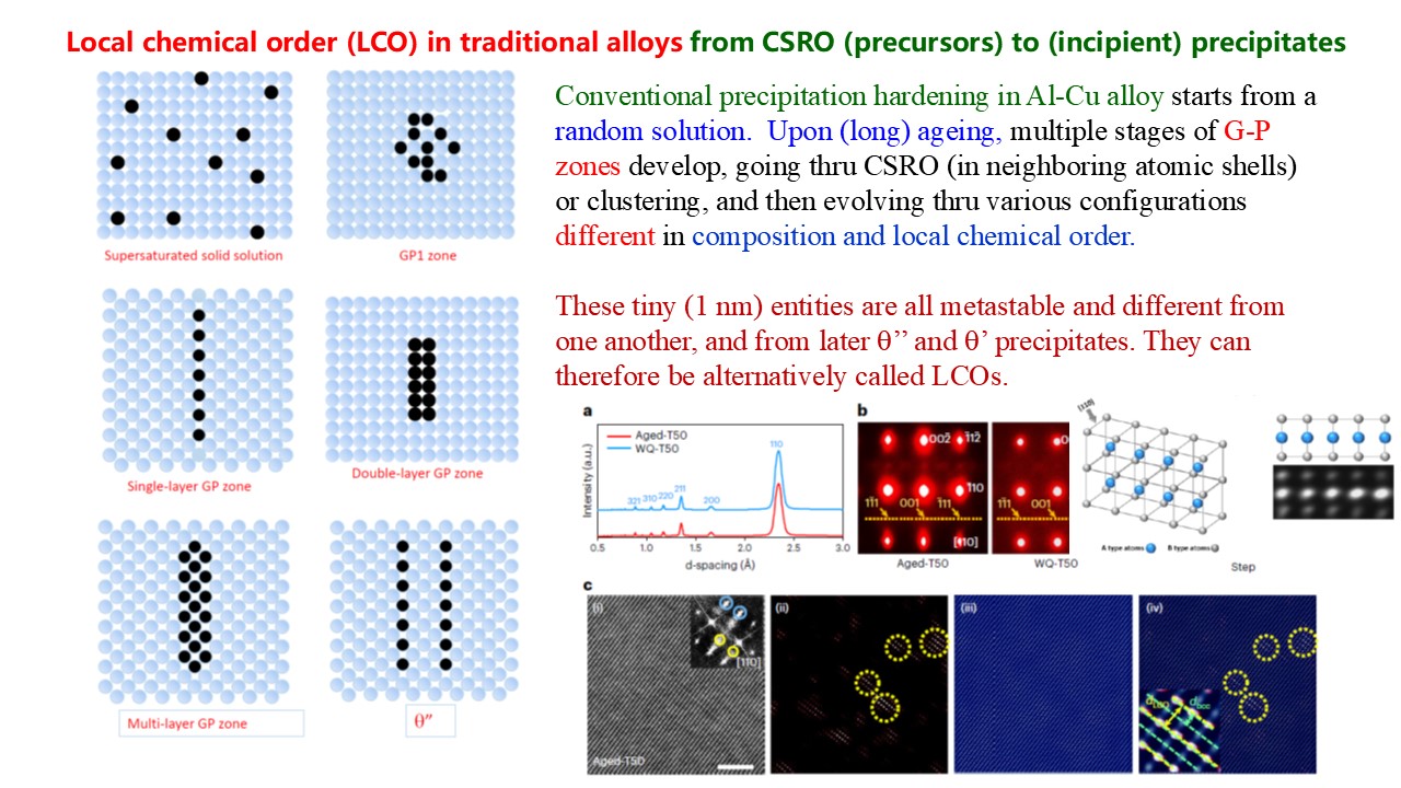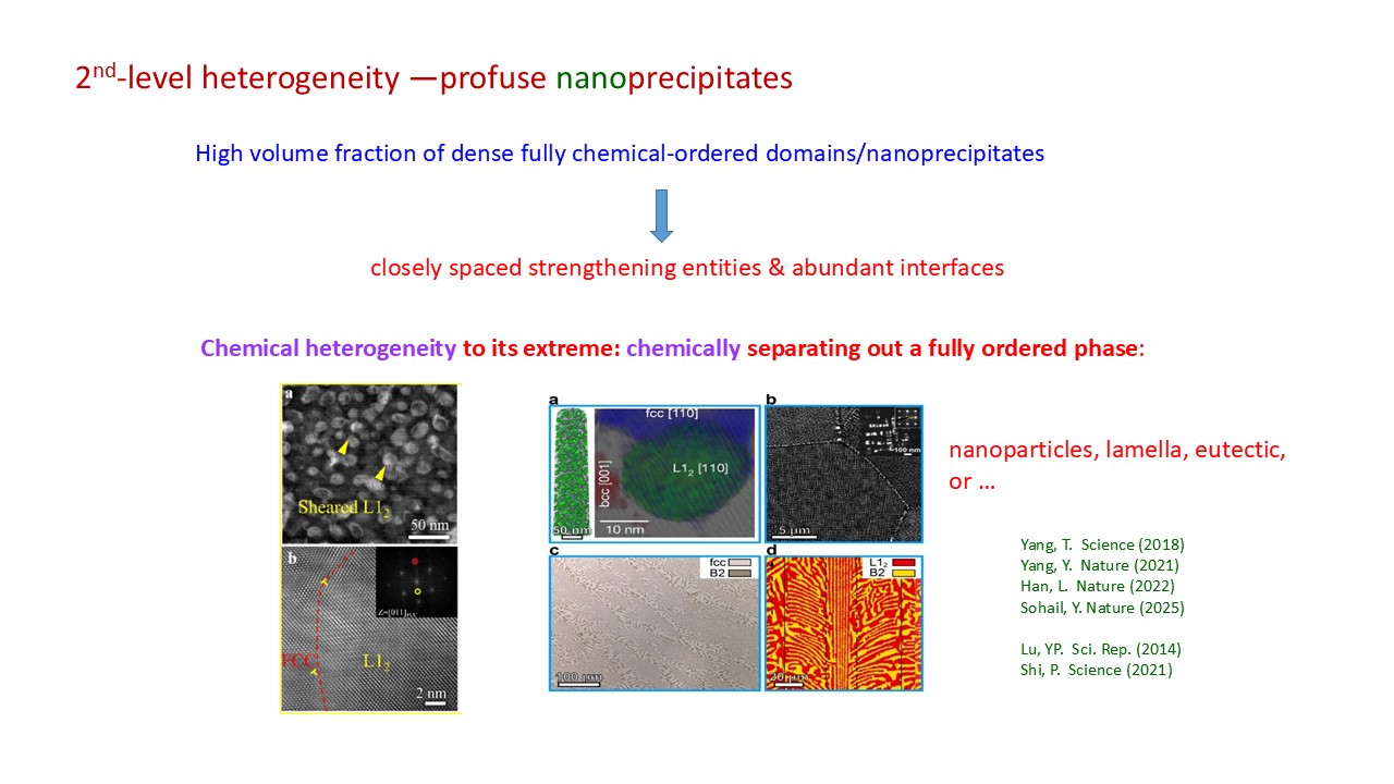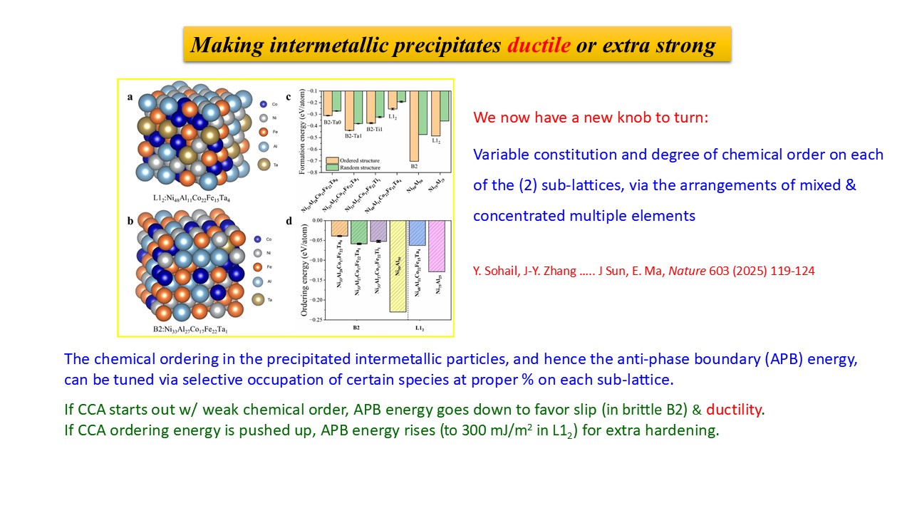 This talk uses two examples, one each for crystalline alloys and amorphous alloys, as case studies for designing the micro/nano/atomic structure to achieve unprecedented properties. In the first example, we discuss how to fill the blank in the strength-ductility space, pushing towards 2 GPa yield strength in combination with 30% uniform tensile elongation [Nature 643(2025)119]. In particular, we leverage additional strengthening and strain hardening mechanisms enabled by the expanded compositional scope in complex concentrated alloys, on top of previously known plasticity mechanisms. We then show that "structure determines properties” also works for amorphous solids, as demonstrated with chalcogenide glasses used for non-volatile memory. There, the key idea is to design a single-type of robust atomic-motif, thus affording little flexibility volume in the amorphous structure. The absence of structural relaxation eliminates the electrical resistance drift that hampers reliable multi-value recognition. The amorphous Cr-Te alloy designed as such offers the first no-drift phase-change memory material [Nature Materials (2025) online Oct. 1].